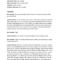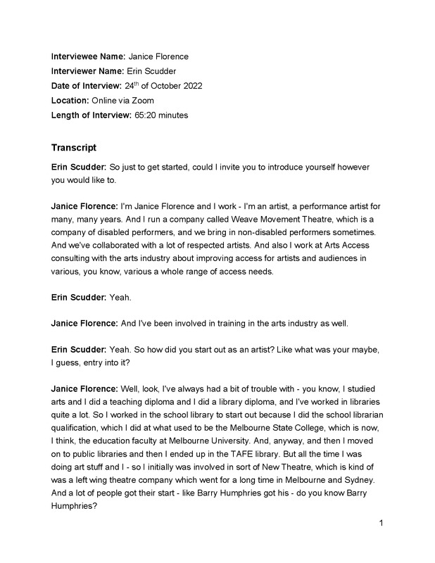 Janice Florence is a veteran performer and Artistic Director of Weave Movement Theatre, which includes disabled performers. During the interview, Janice reflected on her extensive history with dance, both prior to and after acquiring her disability, highlighting the significance of political and personal themes, as well as the use of humour in her work. She discussed the ongoing challenges in securing accessible rehearsal and performance spaces, along with the complexities of funding and recognition within the Disability Arts scene in Australia. Janice also acknowledged the importance of Disability Arts historically and its potential for challenging societal expectations regarding disability. - Identifier