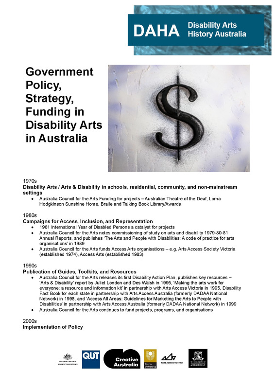 - Hadley, B. (2025). Disability Arts History Australia - 'Government Policy, Strategy, Funding' Infographic. Disability Arts History Australia. Available https://disabilityartshistoryaustralia.net/s/DAHA/page/Reports2025