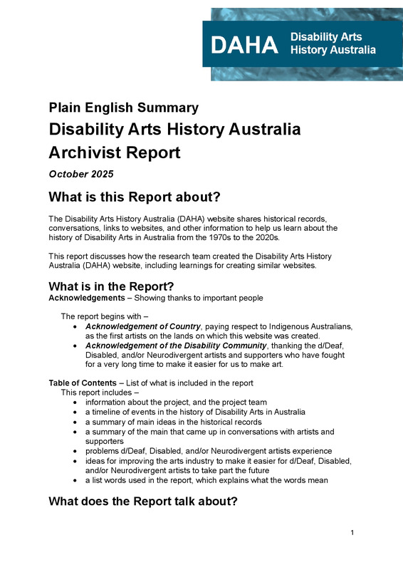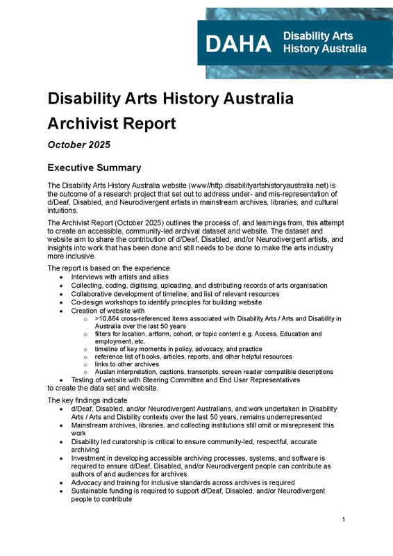 Hadley, B. (2025). Archivist Report. Disability Arts History Australia. Available https://disabilityartshistoryaustralia.net/s/DAHA/page/Reports2025